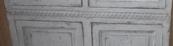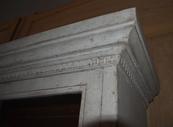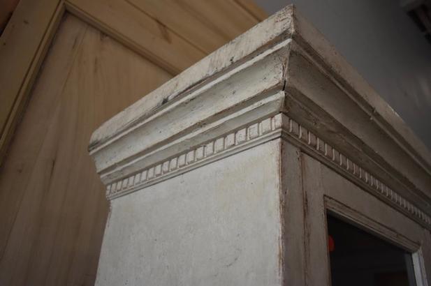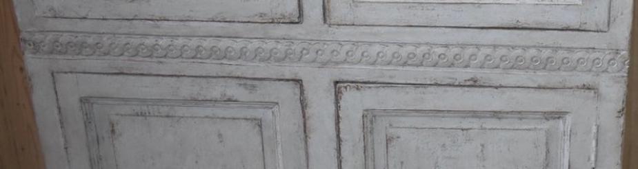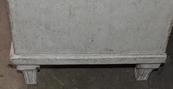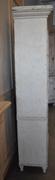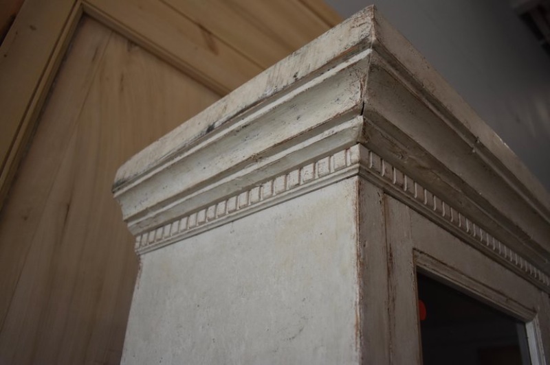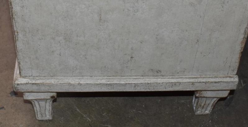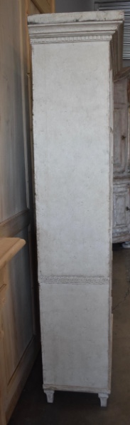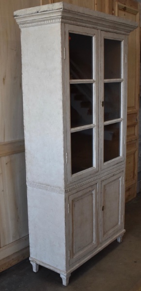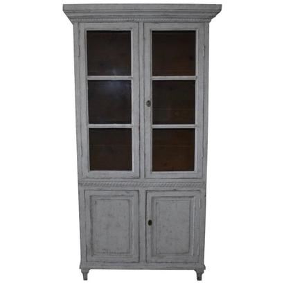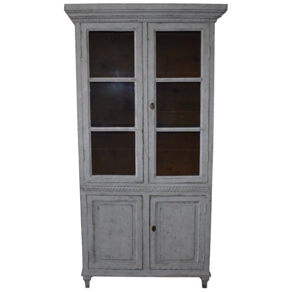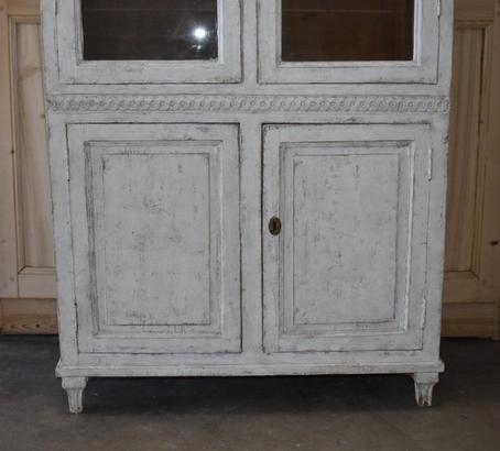 19th century Swedish glass front library cupboard with original glass and carved detail. In the Interior are 2 shelves for storage. Lovely Swedish grey/white color. 77" H x 40.5" W x 14" D