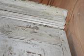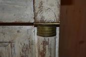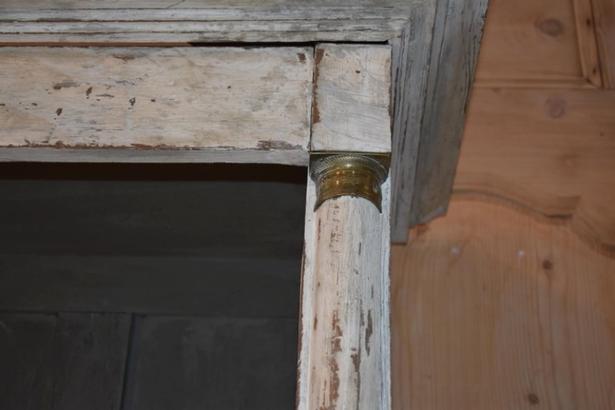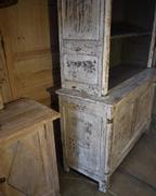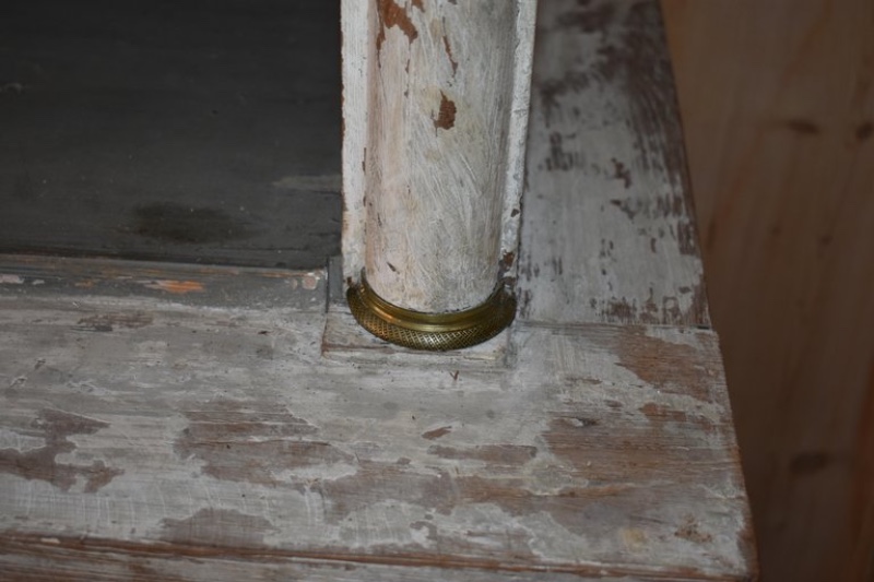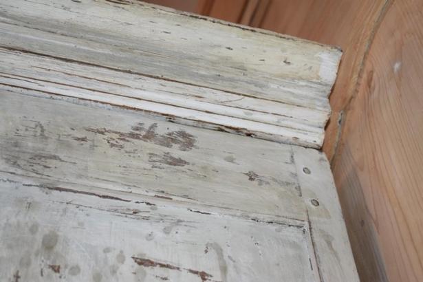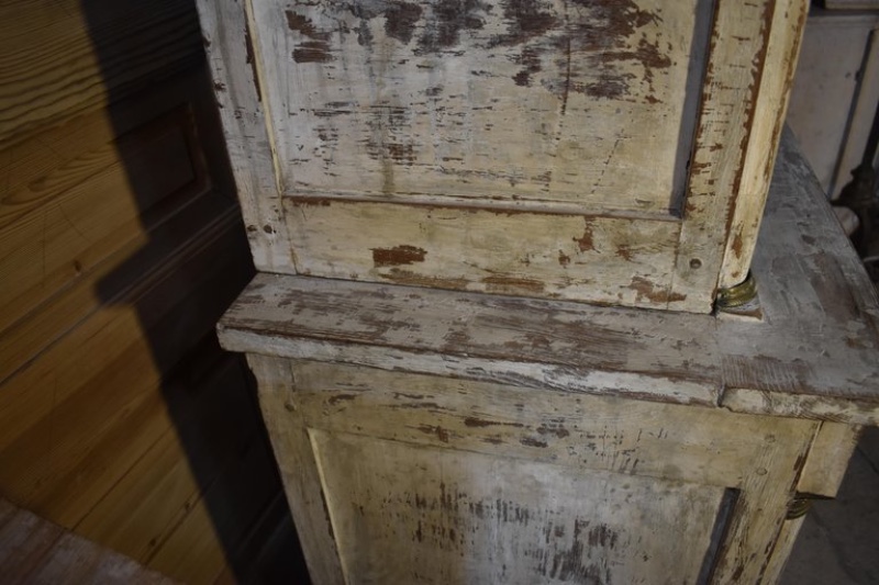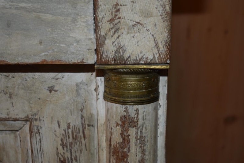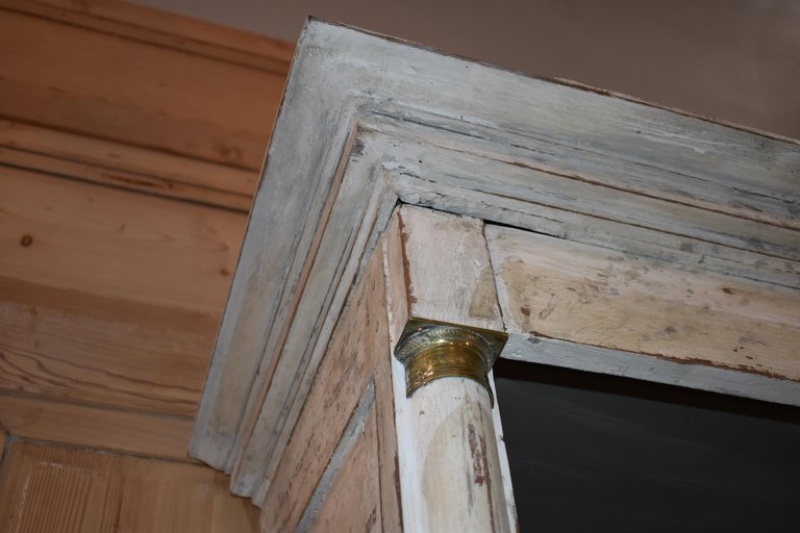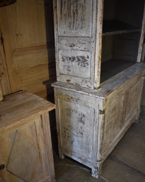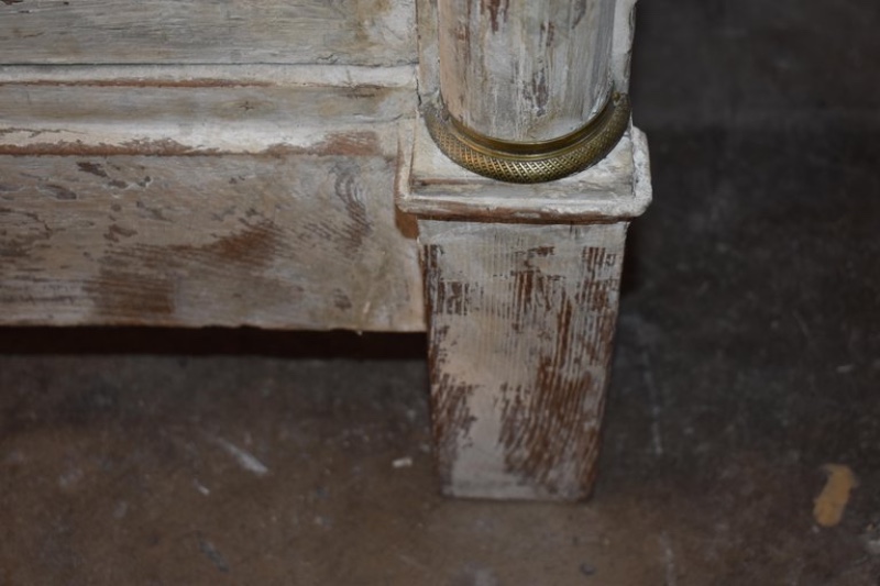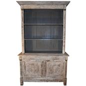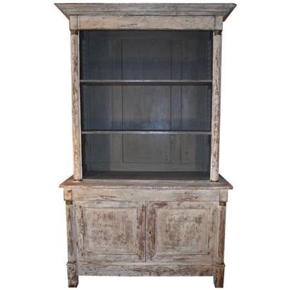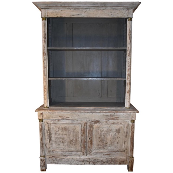 Painted French Empire bookcase with classical detailing. Ormula mounts on base and crown. Cream white color with French blue gray interior. 88" H x 52" W X 20.5" D $4800