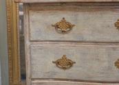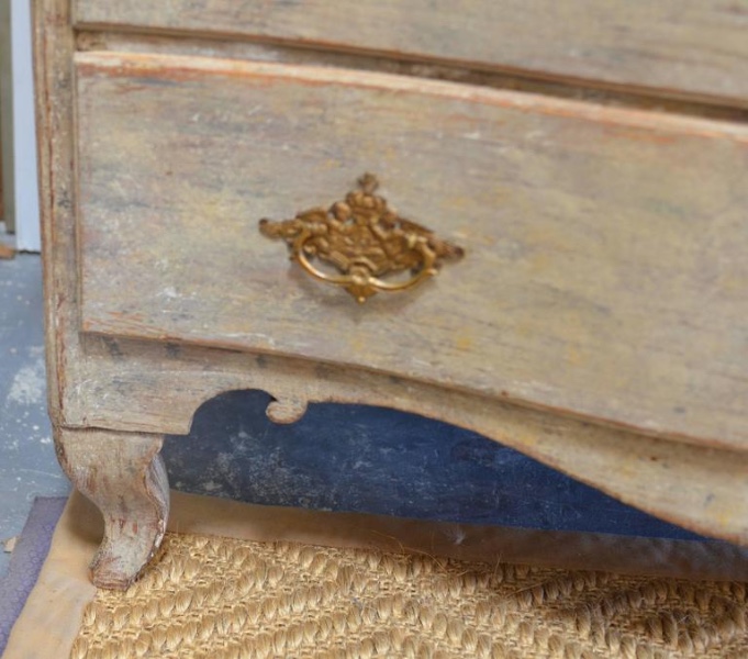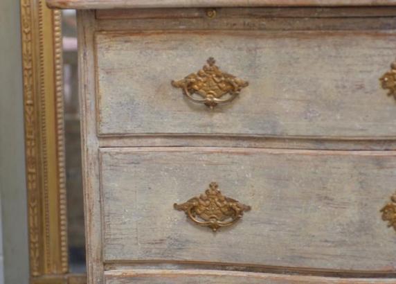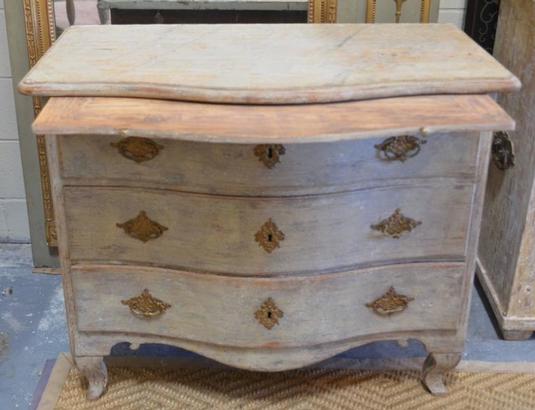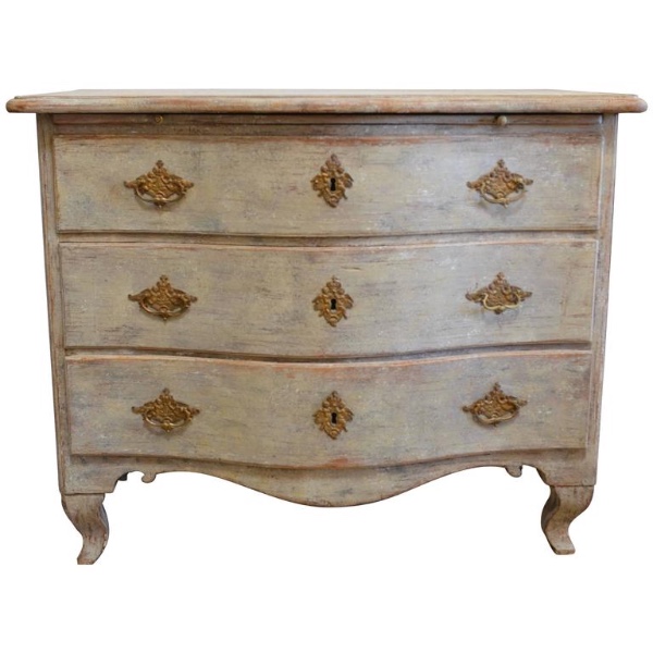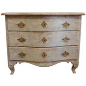 Elegant 18th Century Swedish Rococo three-drawer commode. Lovely serpentine front with scalloped apron over scrolled feet. Pull-out server under top base, all scraped down to the original beautiful Swedish cream/white color. 32" H x 40" W x 24" D.