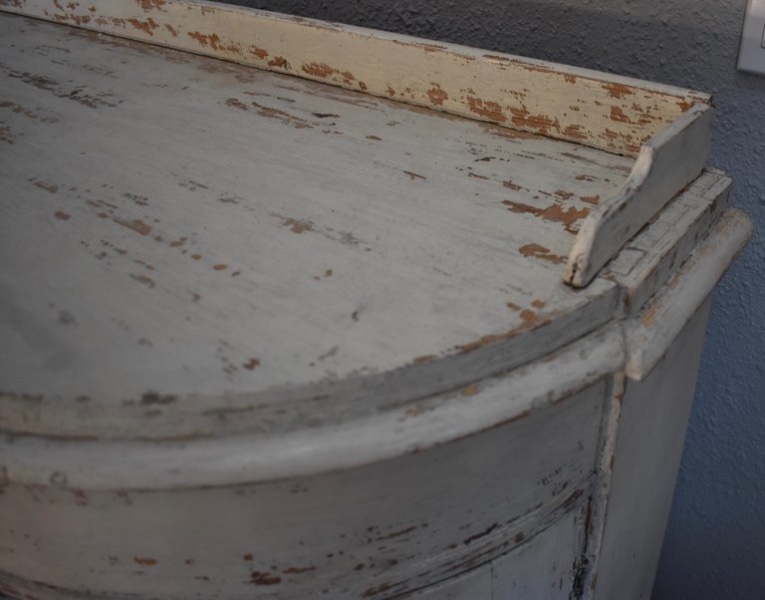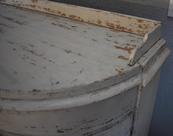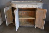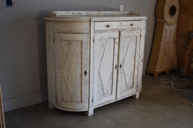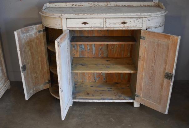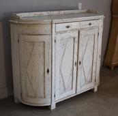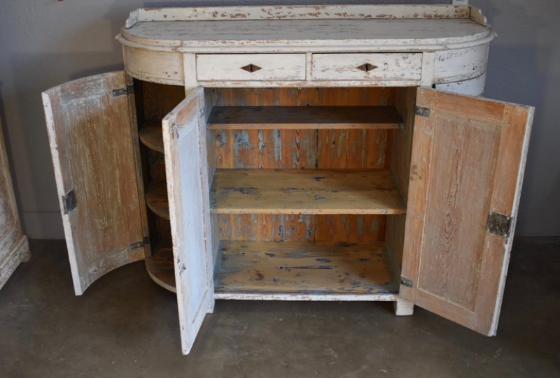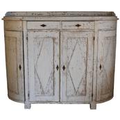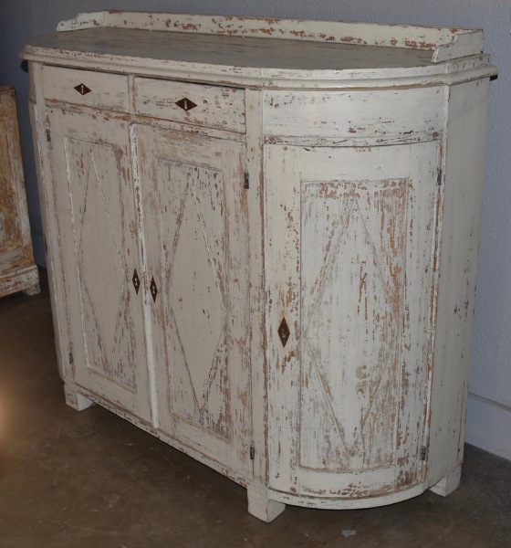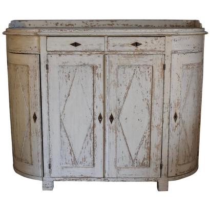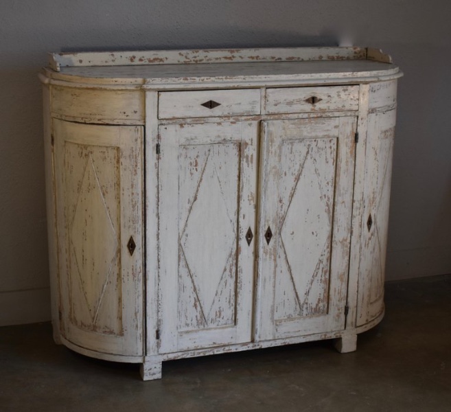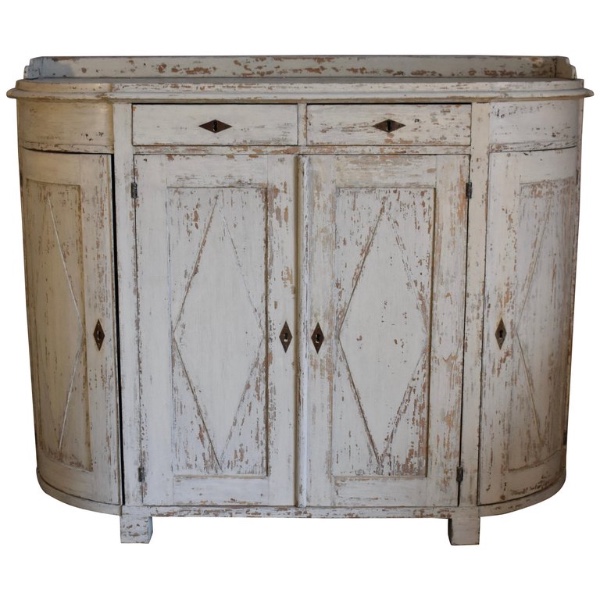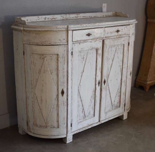 Early 19th century Swedish Gustavian demilune painted four door cupboard. All original with lovely diamond carved paneled doors and three quarter gallery top. Hinges and locks all handmade. 44" Total H x 42" Buffet H x 20" D x 55" W $5500