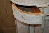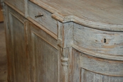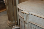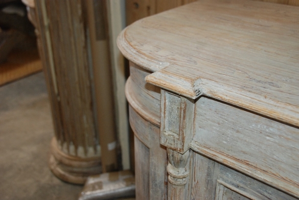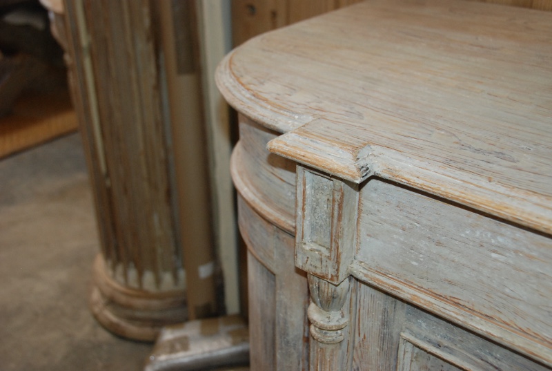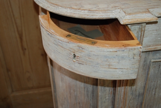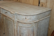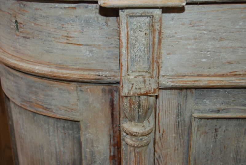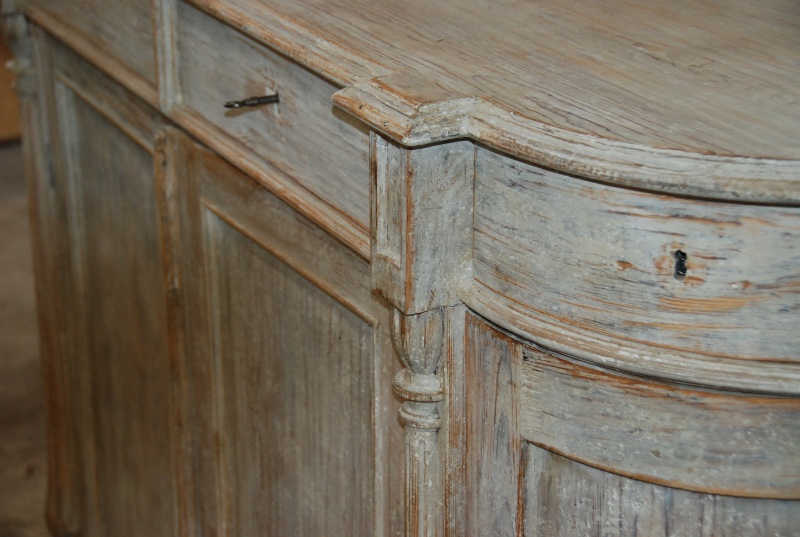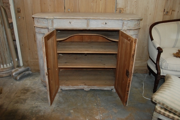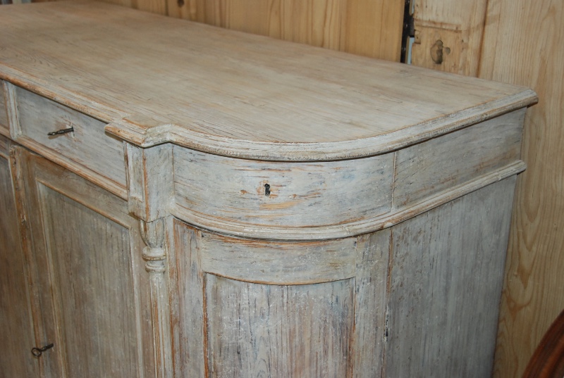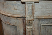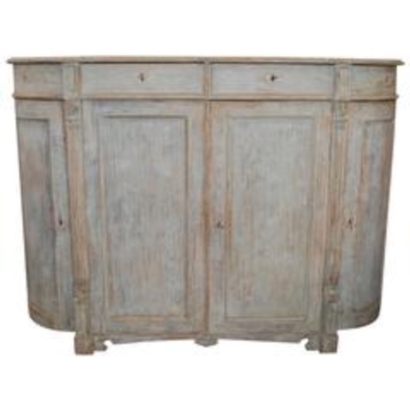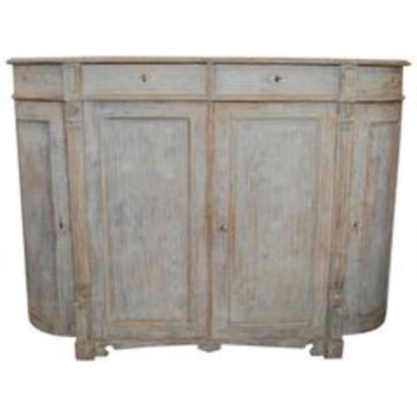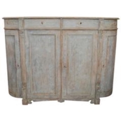 19th century Swedish four-door demilune buffet or server, scraped down to original old blue/cream color. Lovely paneled doors with reeded carved detail.