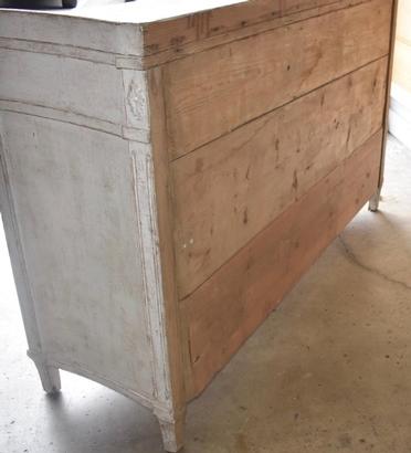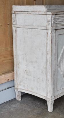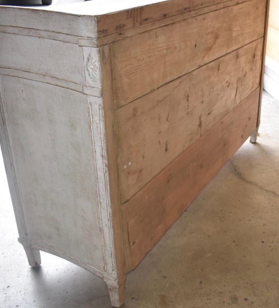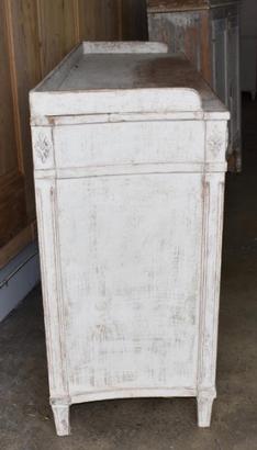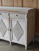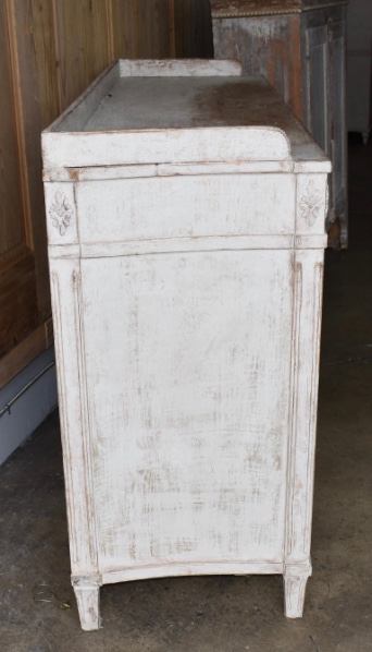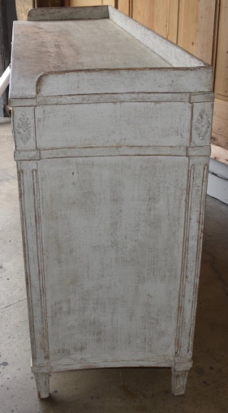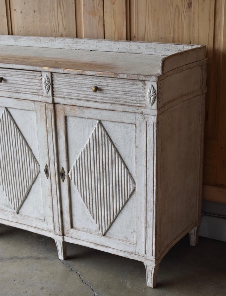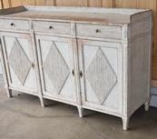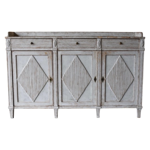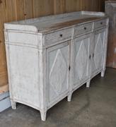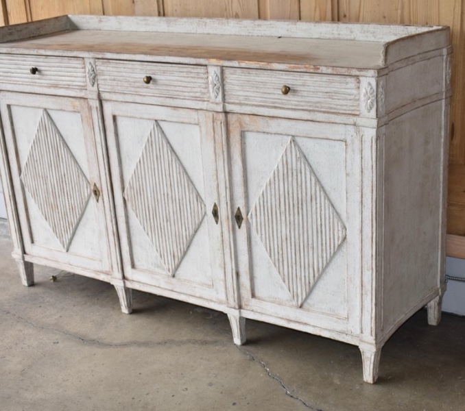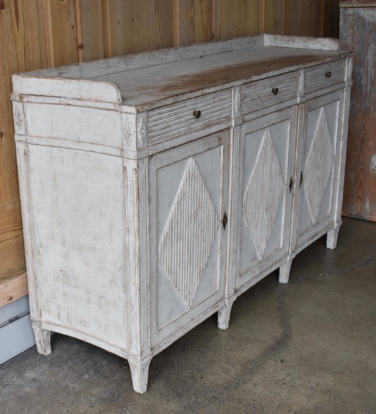 Early 19th century Swedish Gustavian style painted three door sideboard. Beautiful curved sides with wonderful three hand-carved drawers over three reeded front paneled doors. Each door is adorned with a diamond pattern. The top is surrounded with a three quarter gallery and carved posts and fluted sides. Lovely cream gray/ color with nice worn patina. 40" H x 68.5" W x 20" D