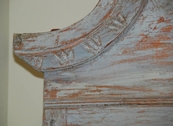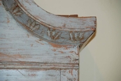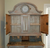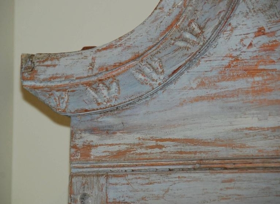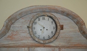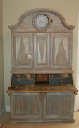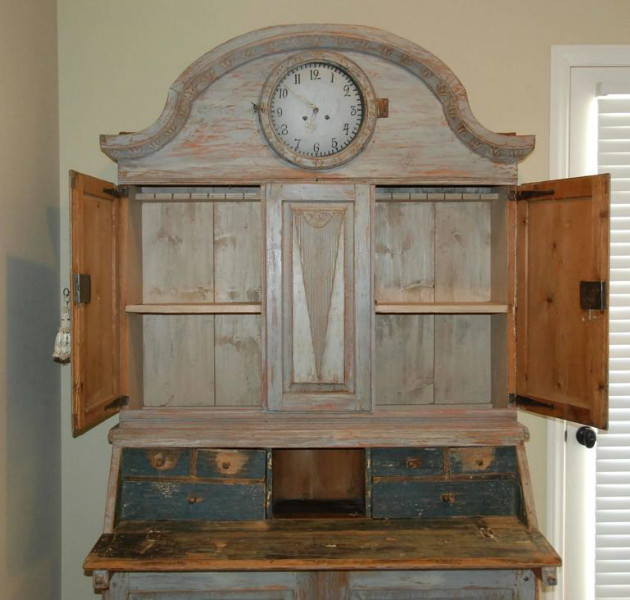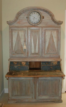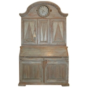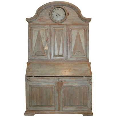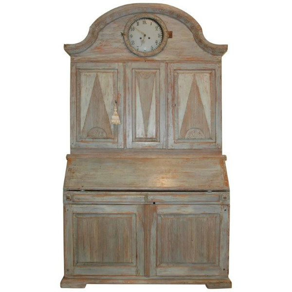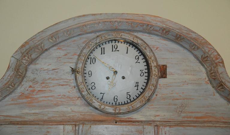 Beautiful Swedish Rococo clock secretaire scraped down to the original Swedish blue color. Lovely carvd arched cornice and trim. Reeded paneled doors with diamond design. Clock comes with weights and pendulum. 88" H x 50" W x 22" D. $10,500
