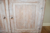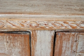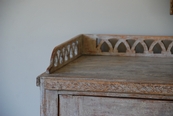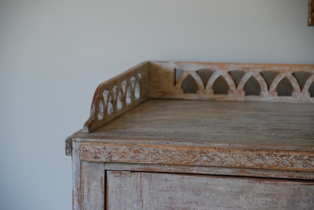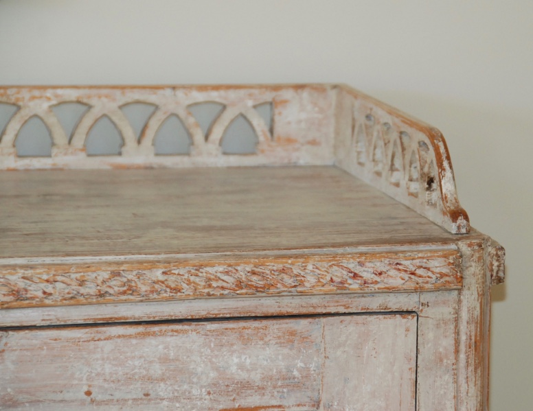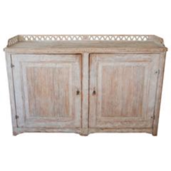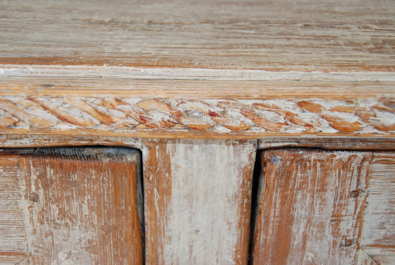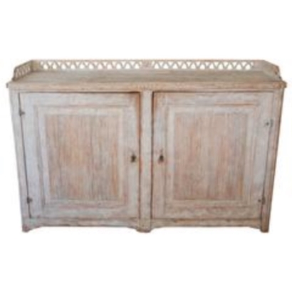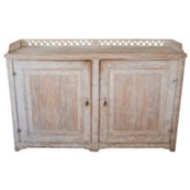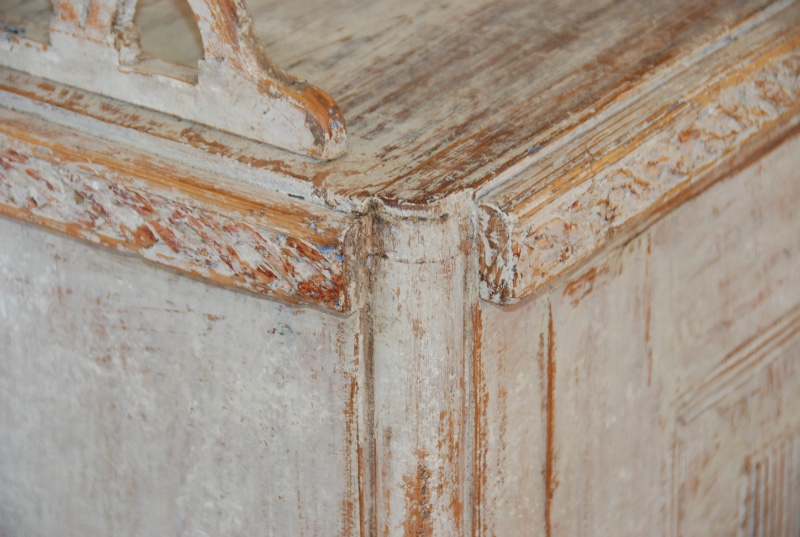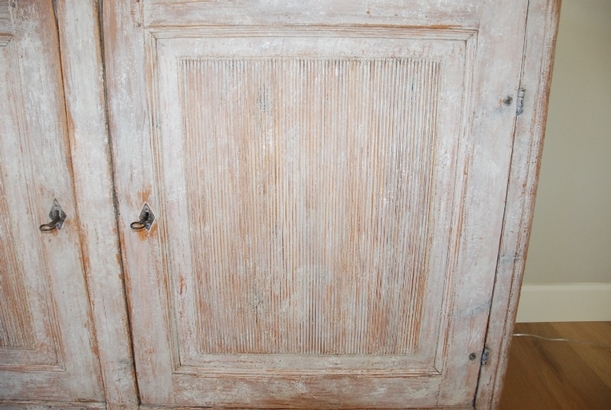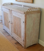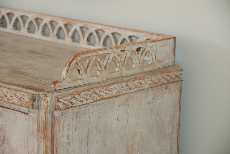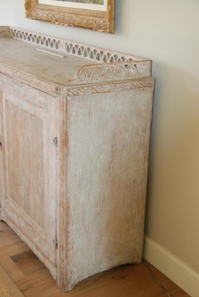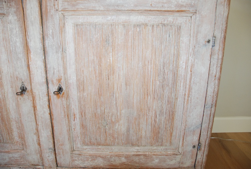 Beautiful large period Gustavain sideboard. Raised reeded paneled doors with lovely raised fencing and elegant carving of the period. Original cream colored paint with hints of blue. Great size with plenty of great storage underneath.