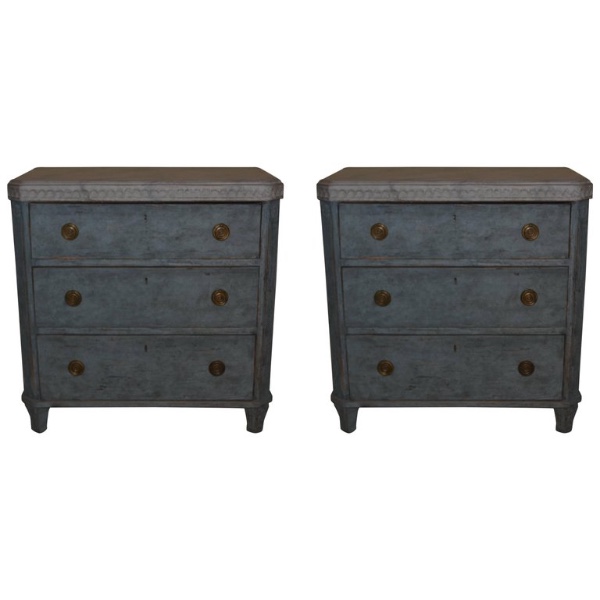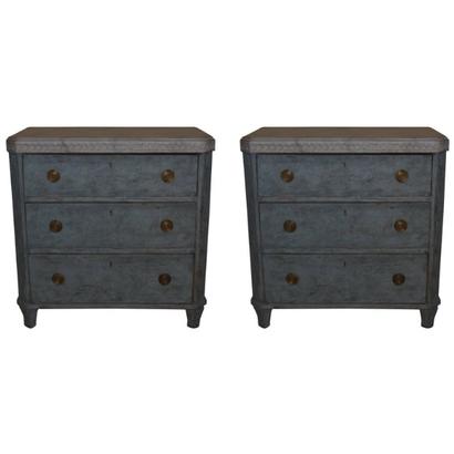 Pair Swedish painted chests in lovely Swedish blue color. Carved border trim with beautiful faux grey marbled top. Classic square tapered legs, brass hardware and raised panel detail. 32.5" H x 32" W x 18" D
