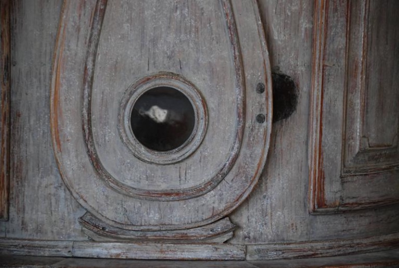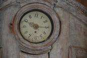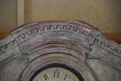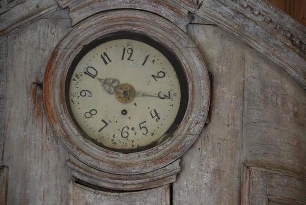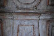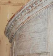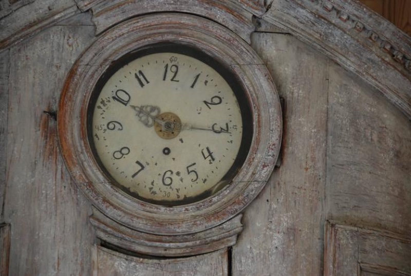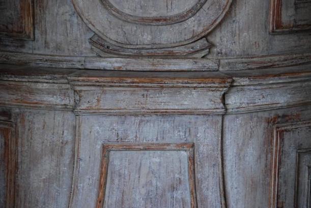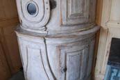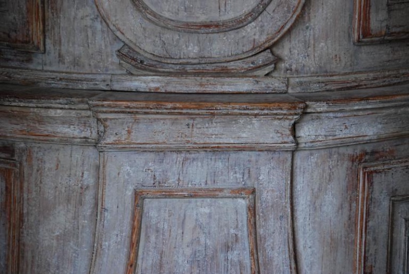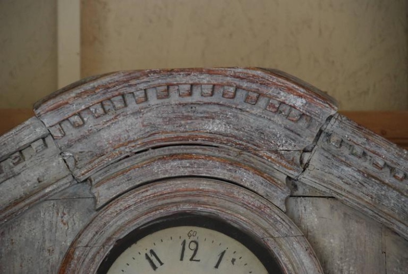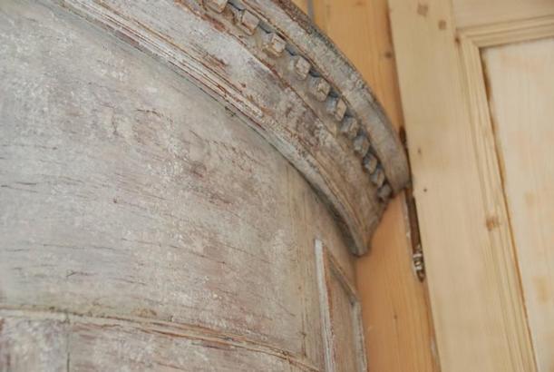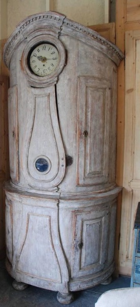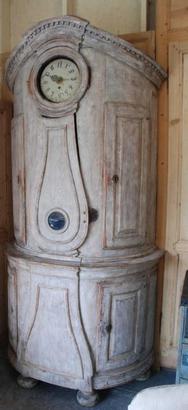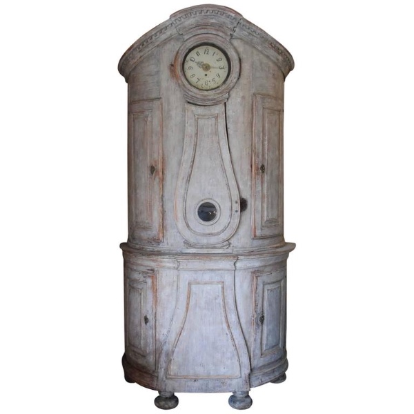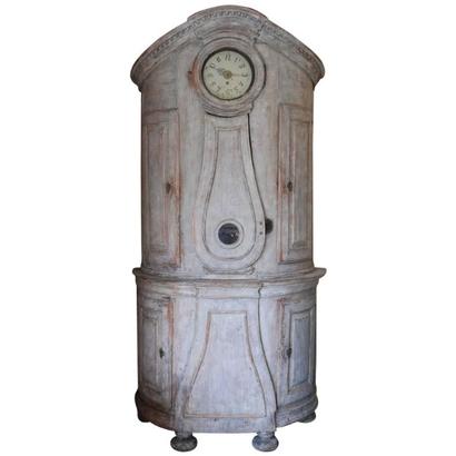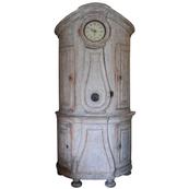 Beautiful 18th Century Swedish Demi lune Clock Cupboard. Four raised paneled cupboard doors open to lovely storage on the sides. Dental carving on the cornice apron with elegant paneled clock detail in the center. All Scraped down to original Swedish soft grey/ white color. Comes with pendulum and weights. 96.5" H x 49" W x 24.5" D $10,500