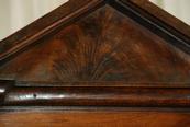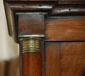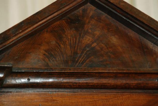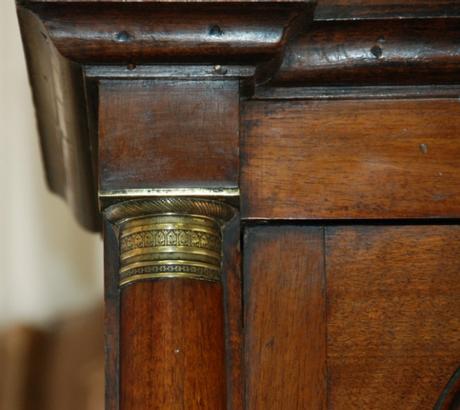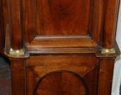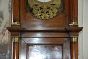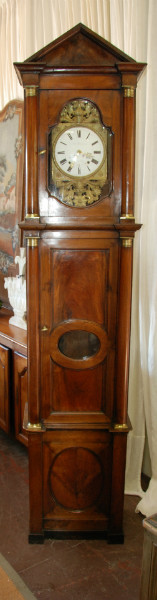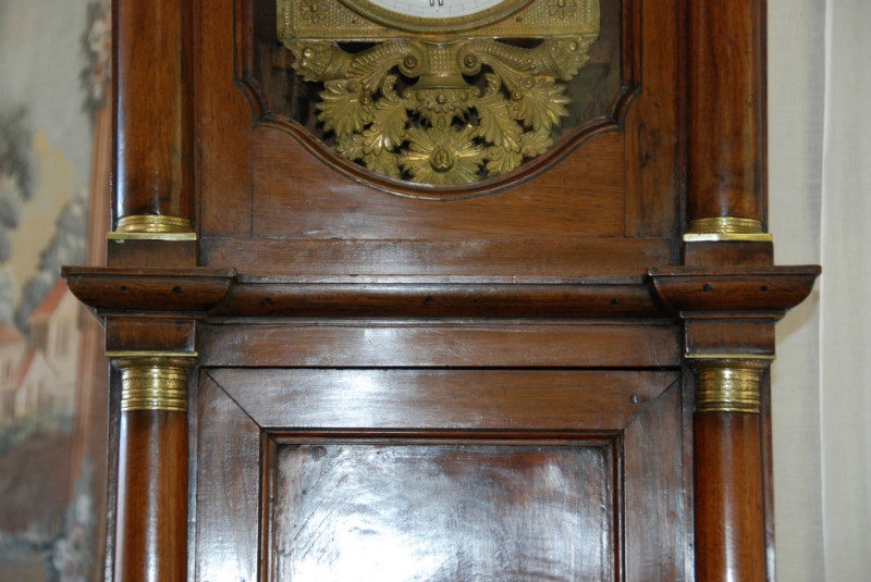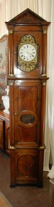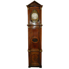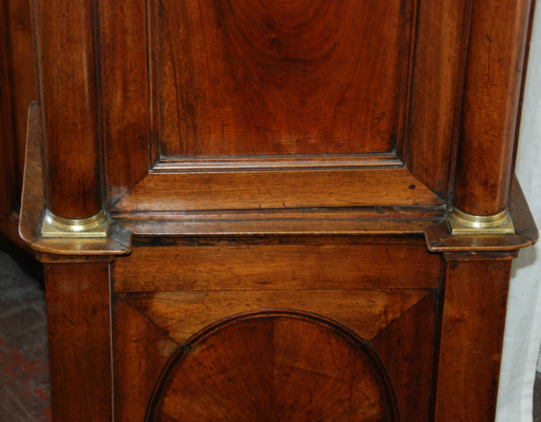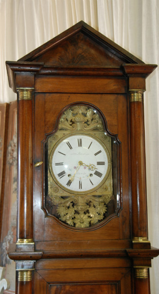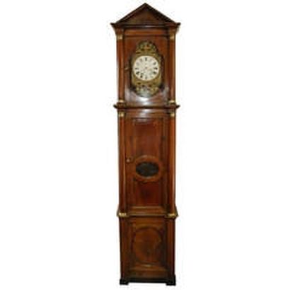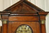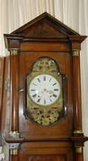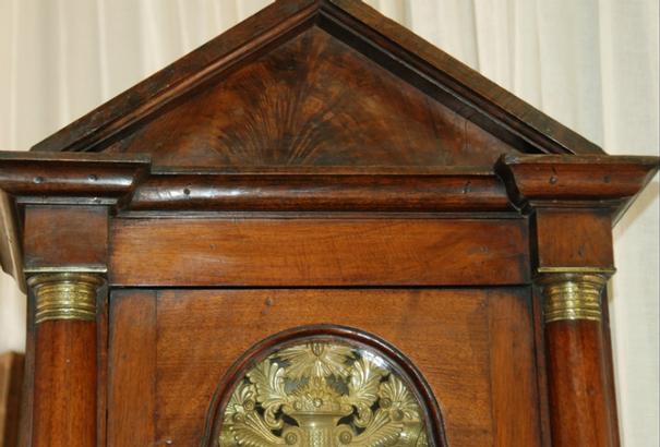 Very handsome French Empire walnut horloge. Enameled face and figural brass surround original brass fittings, hinges and knobs. Comes complete with original weights