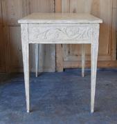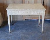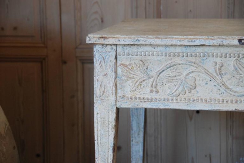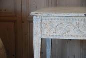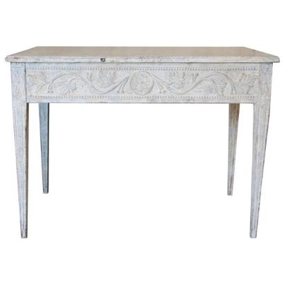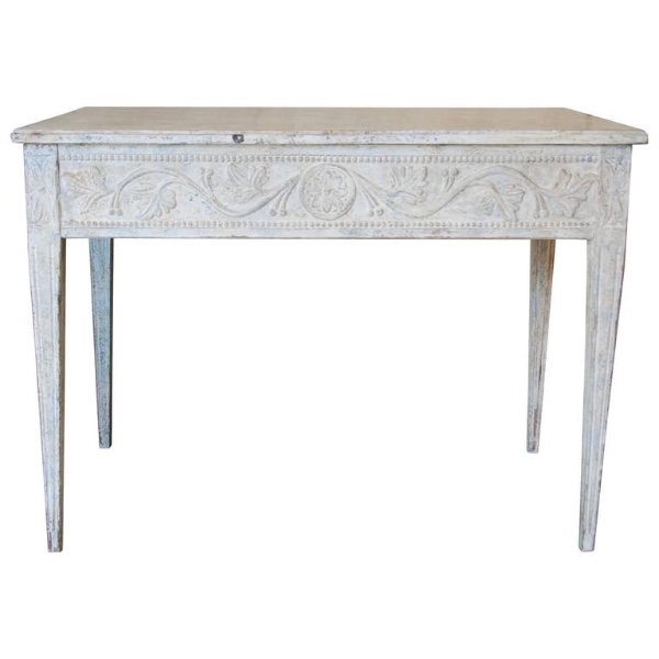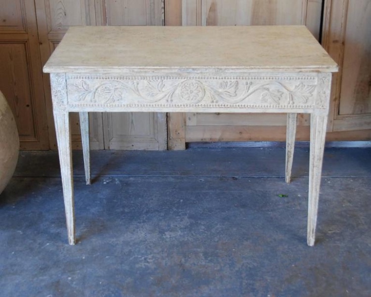 19th Century Swedish Console Table with lovely carved apron and tapered fluted legs. The beautiful carving extends all around the table. The painted color soft Swedish cream/white. $4200 30" H x 40" W x 24" D