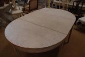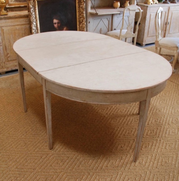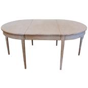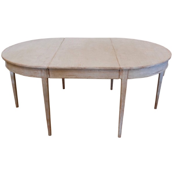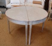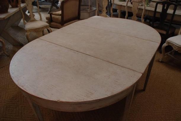 Lovley 19th Century Swedish oval dining table with carved dental apron. Terrific design with detachable leaf that can be removed to form a 43" round table or two seperate demi lune tables. Swedish cream/white color 29"H x 70"L x 47"D. $7900