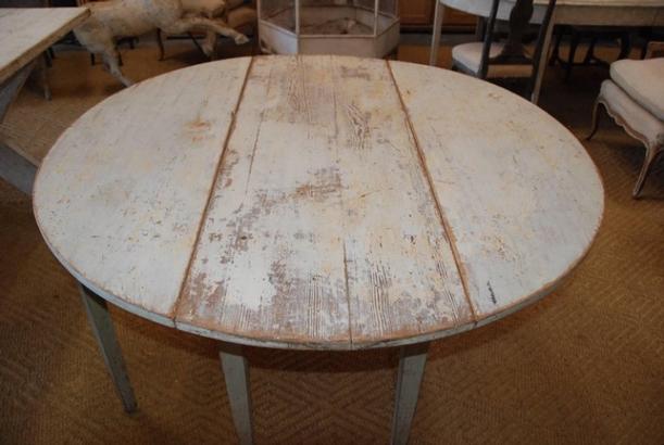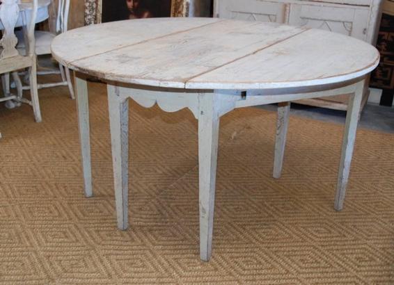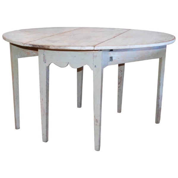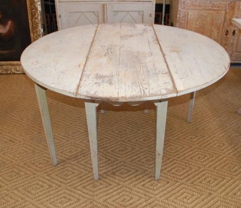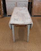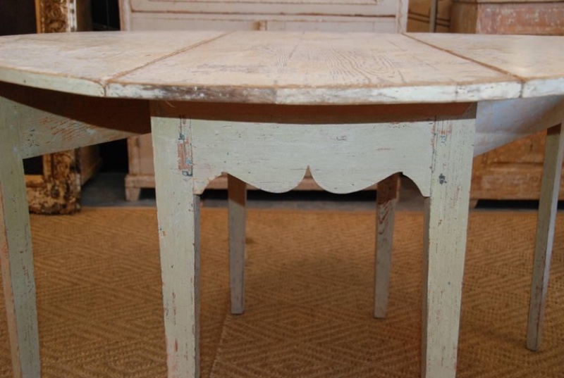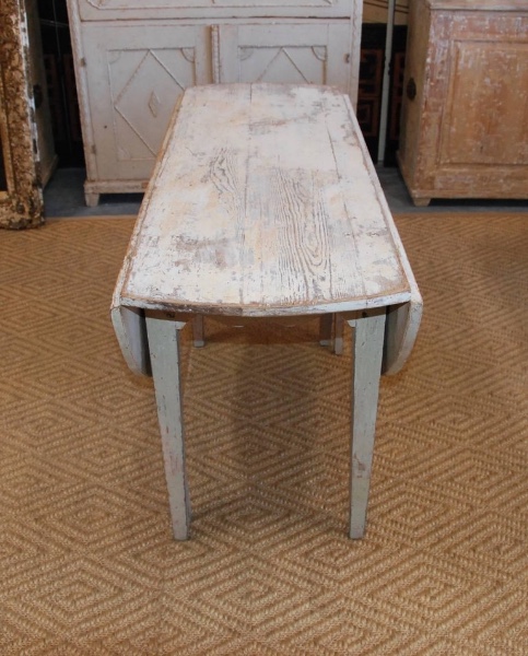 Early 19th Century Swedish drop leaf table. Original worn paint patina. The top is a lovely aged pine and the base is a pale Swedish green/blue. Closed the table measures 18" W. 31"H x 53"W x 52" D. $5500