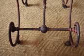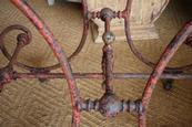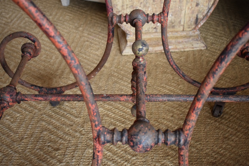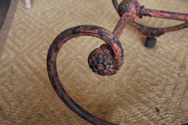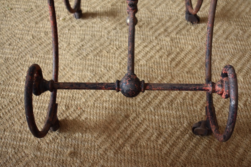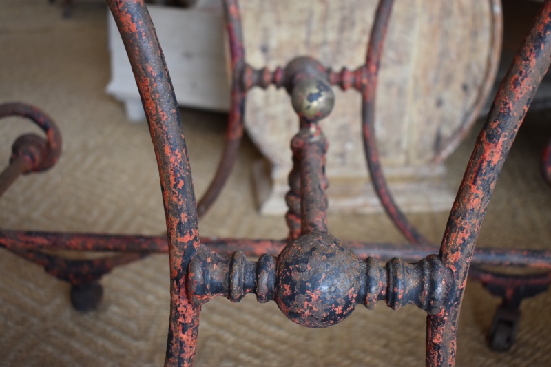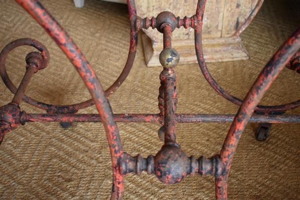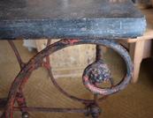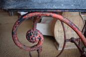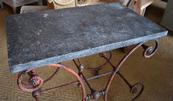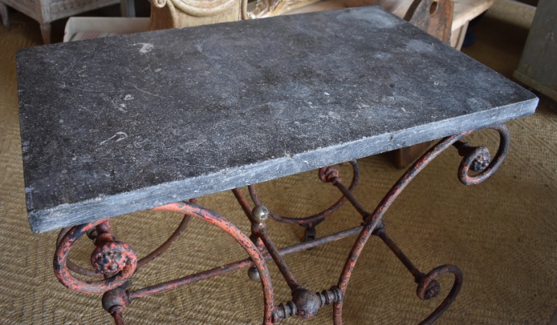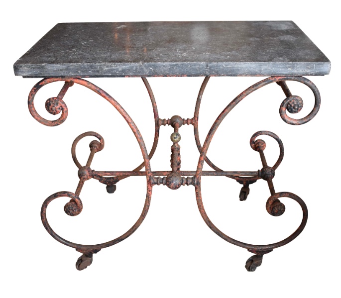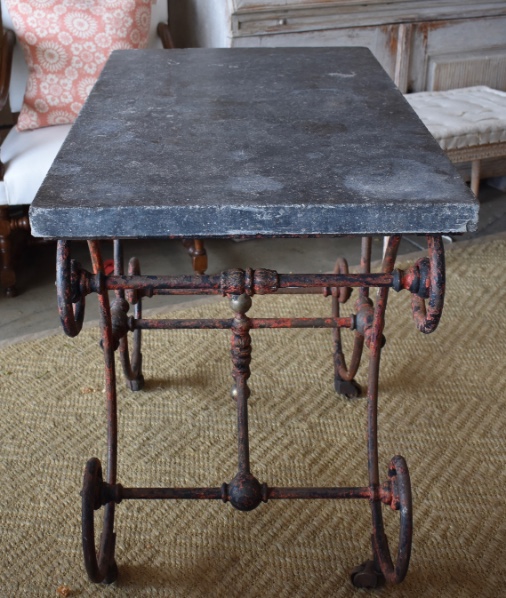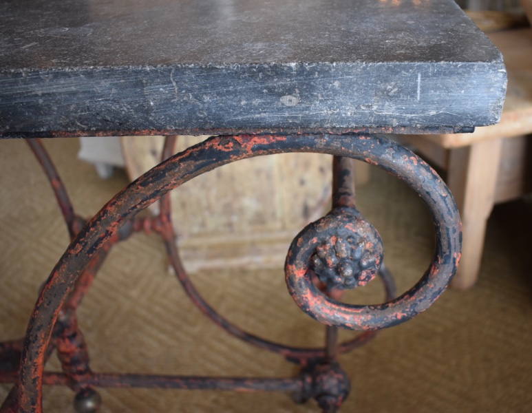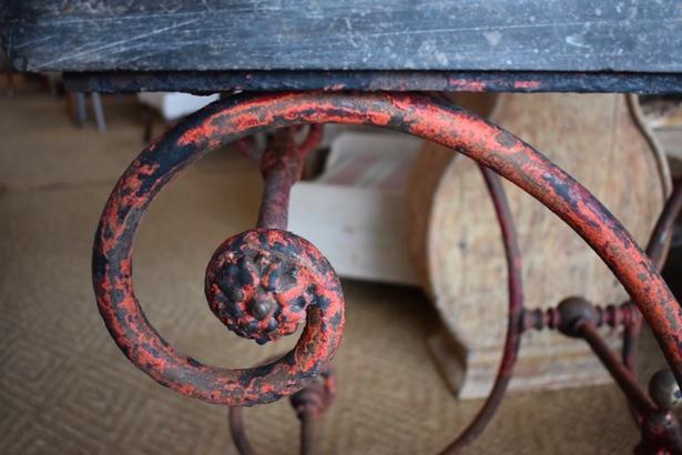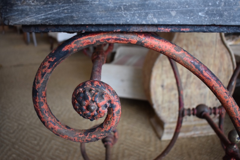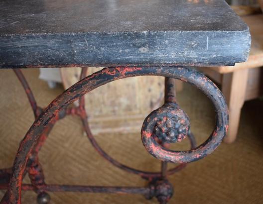 Wonderful French 19th Century Iron and Stone Table Du Boucher or Butcher's Table. Great aged red patina with original working wheels and black stone top.
