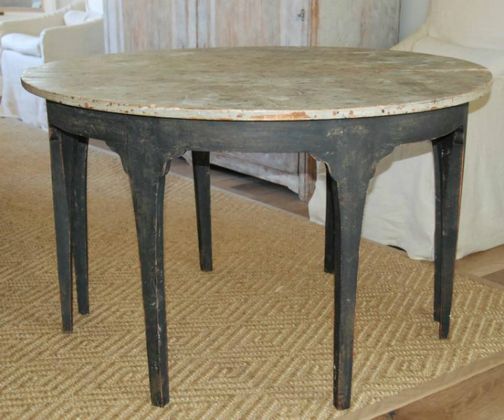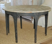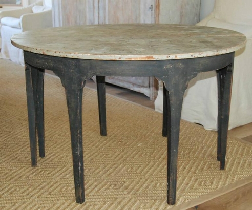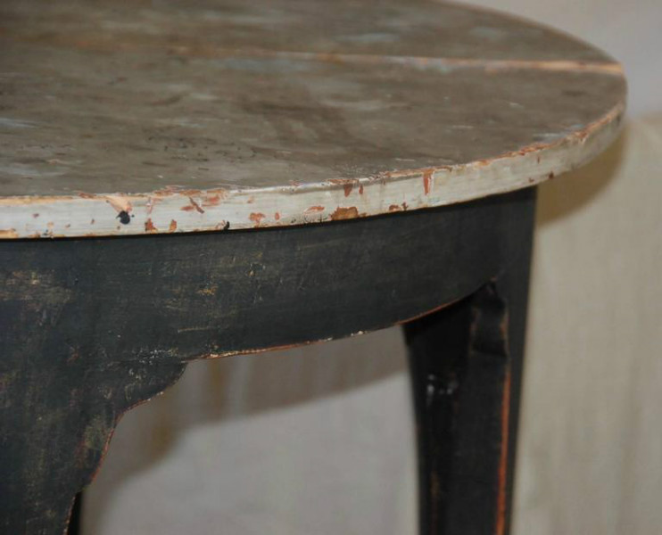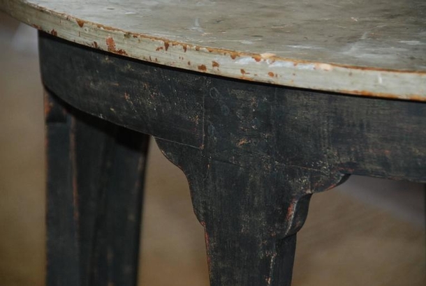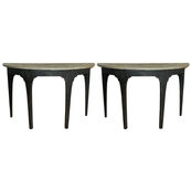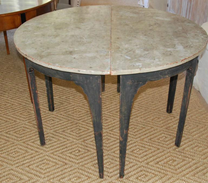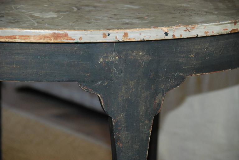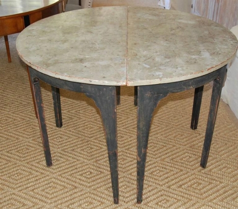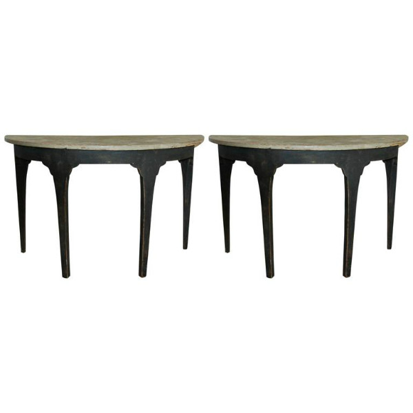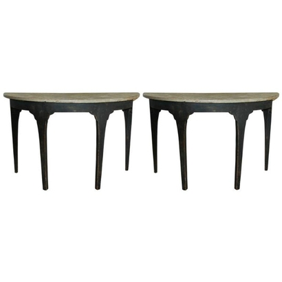 Beautiful pair of unique Swedish Demilune tables. Old black patina with painted marbleized top.