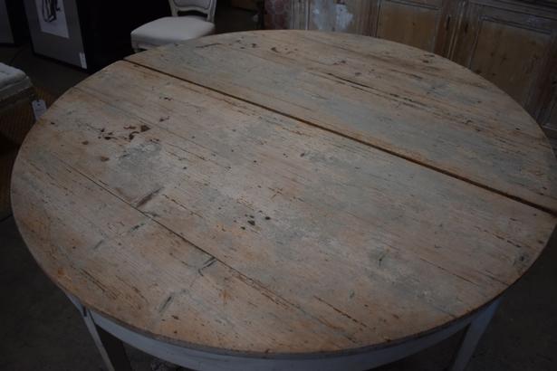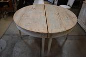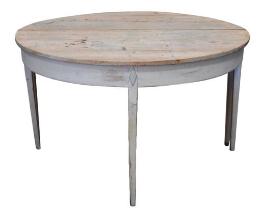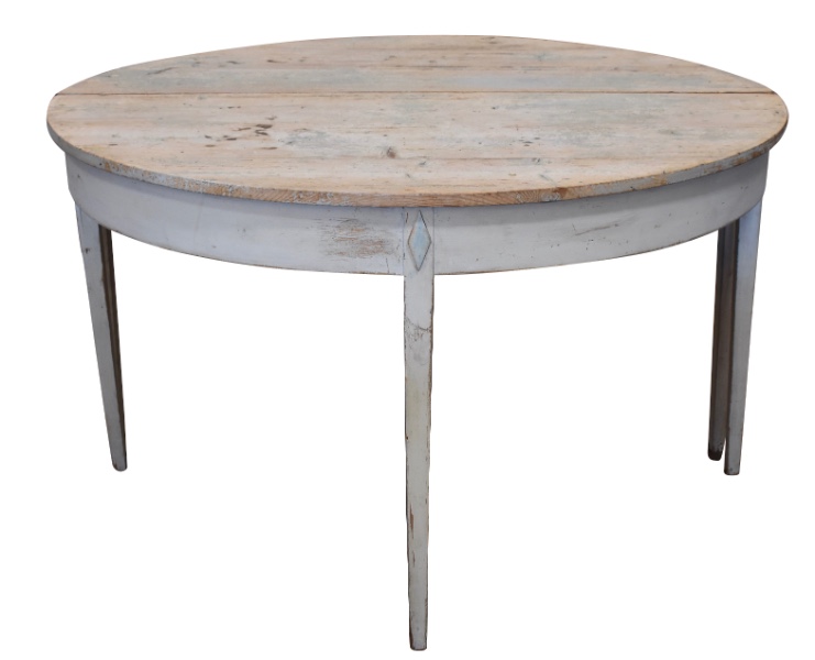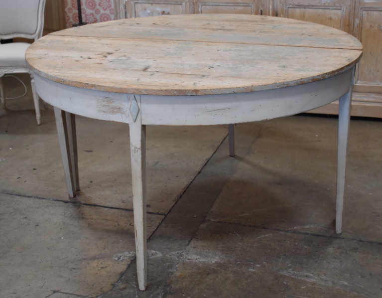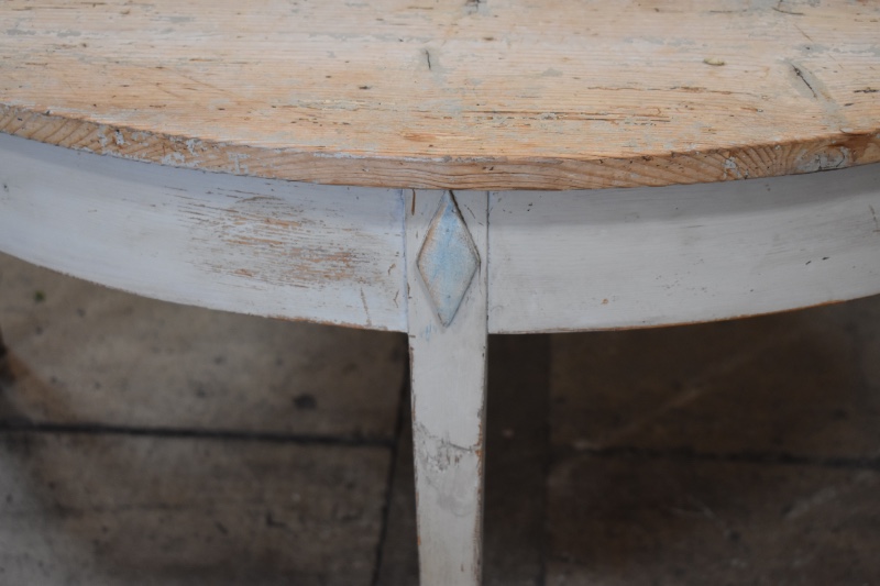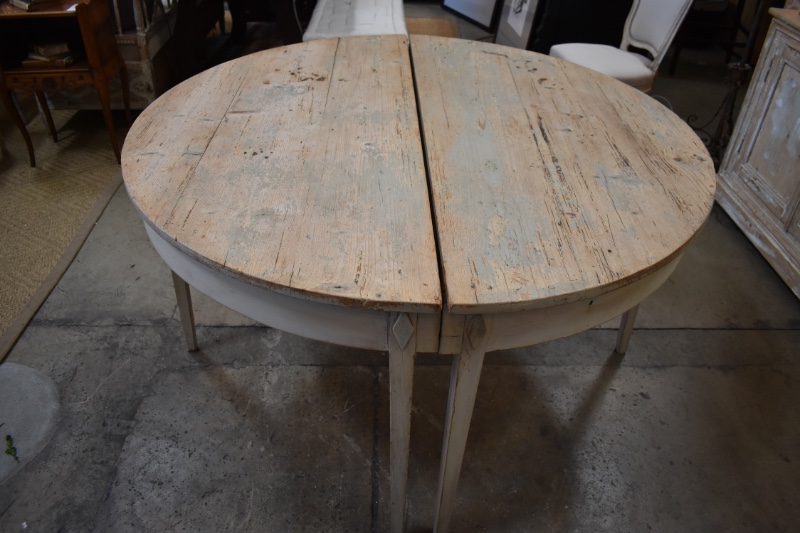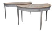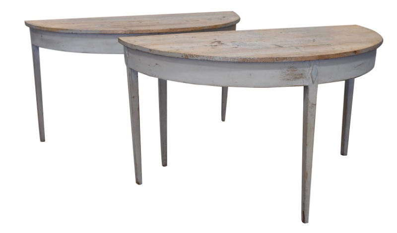 Pair of 19th Century Swedish Demi lune tables with hints of soft Swedish green/blue original color. Lovely tapered legs with diamond carvings on the apron. Can be set apart or together for a lovely 51" Dining Table.