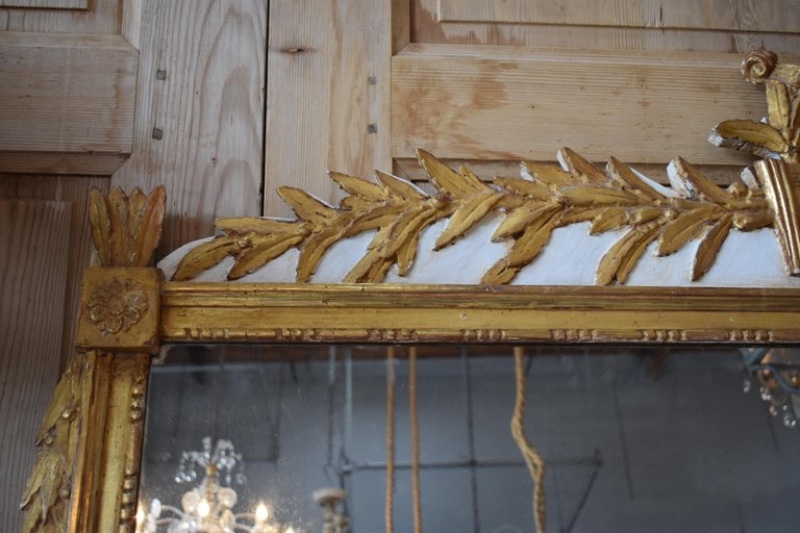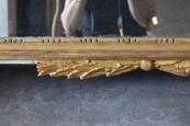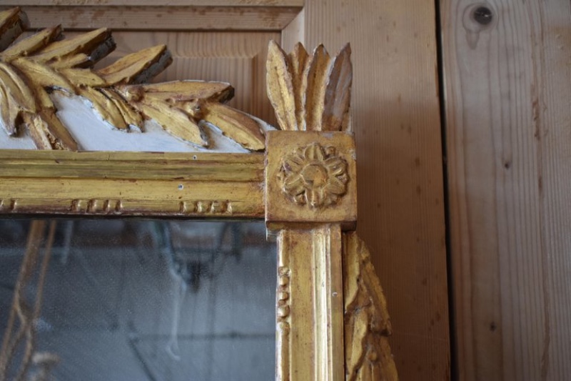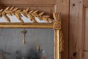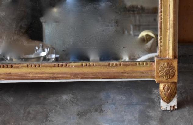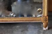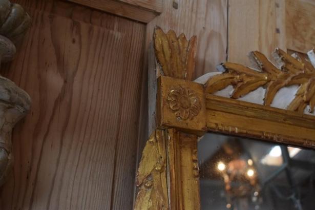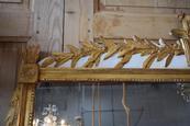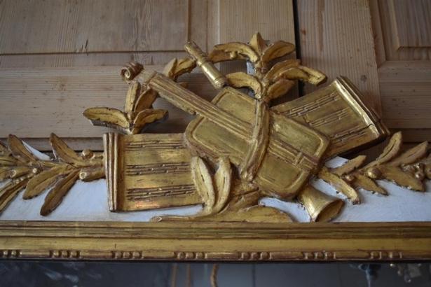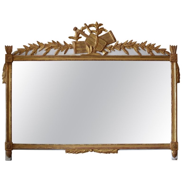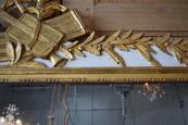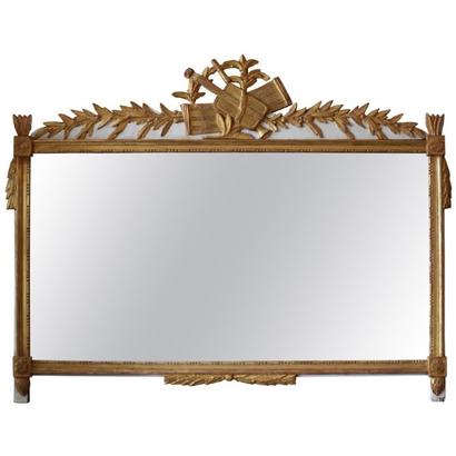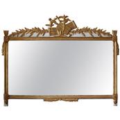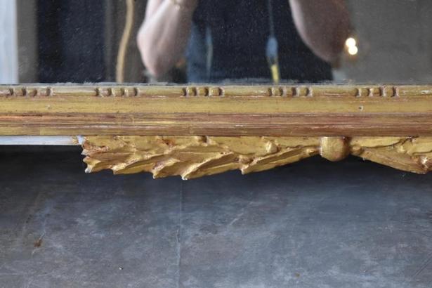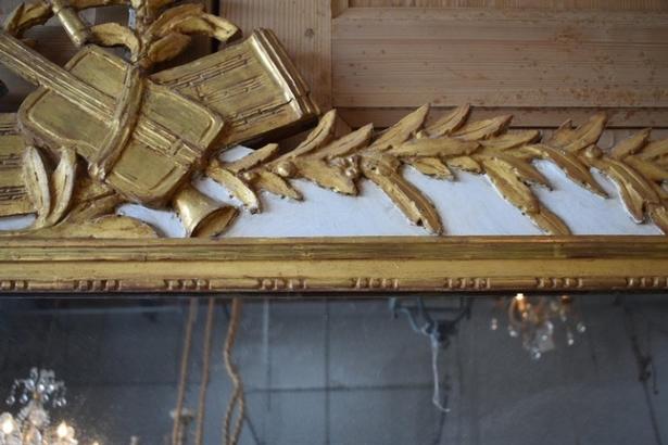 Large over the mantle 18th Century French Gilded Miroir de Musique. Lovely detailed carving of musical instruments adorning the top with carved laurel leaves along the base. Mercury glass 51" H x 64" W x 2" D $4200