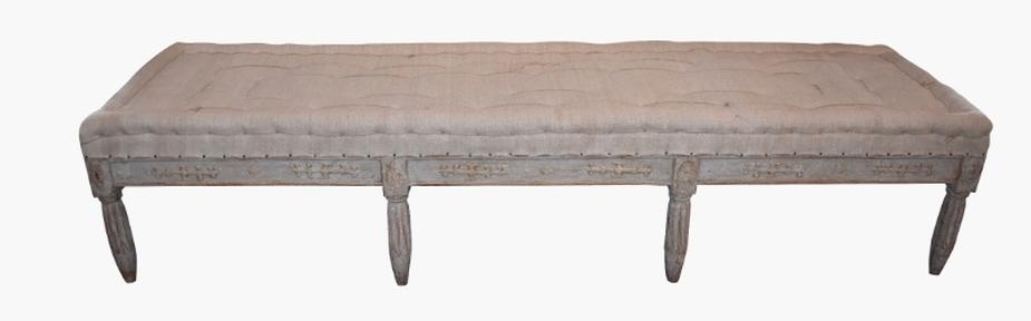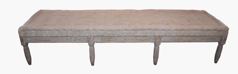 Early 19th Century Swedish Gustavian long footstool dry scraped to original cream/ white color. Beautiful hand carved detail on tapered legs and apron. All newly upolstered in the tradtional Swedish style with antique Swedish hemp. $5500/ trade pricing available. 74" L x 16" D x 20" H