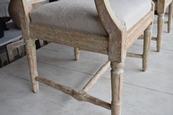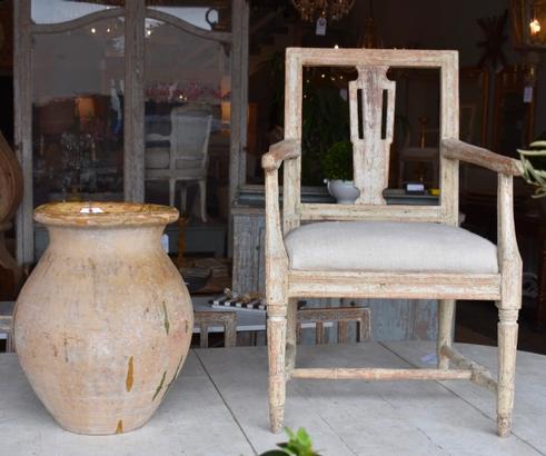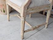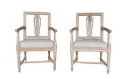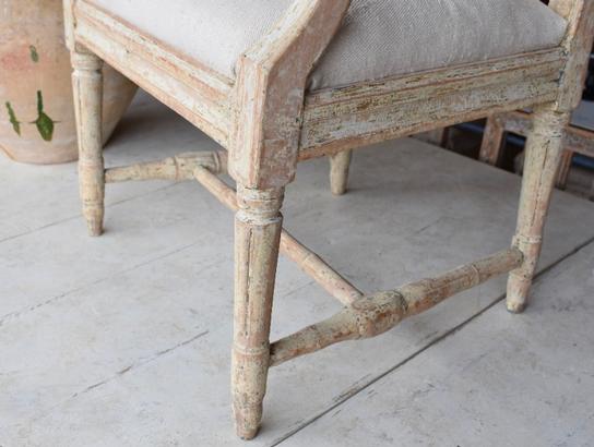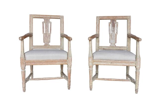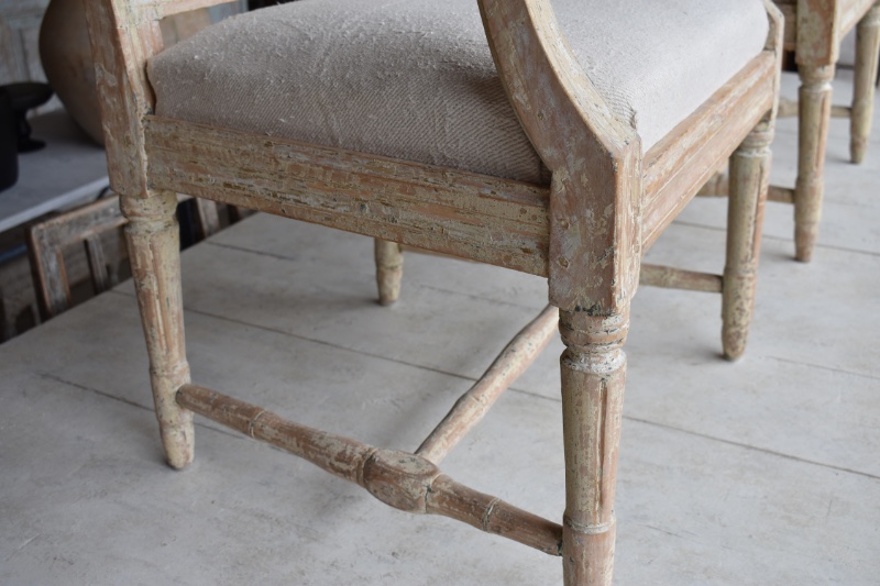 Pair of 18th Century Swedish Arm Chairs hand scraped to the original pine cream/white color. Elegant tapered legs with carved base stretchers. Lovely aged patina...Upholstered in antique Swedish Hemp. $4800