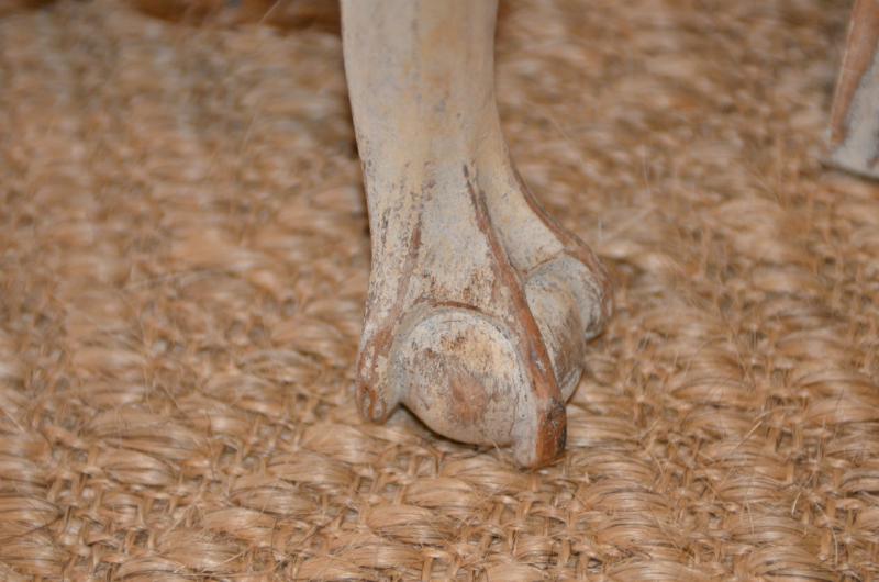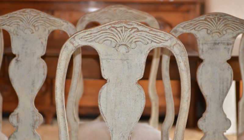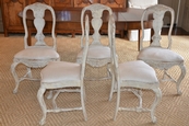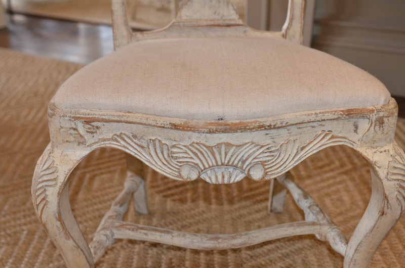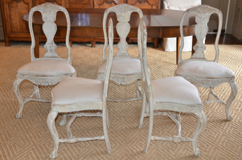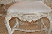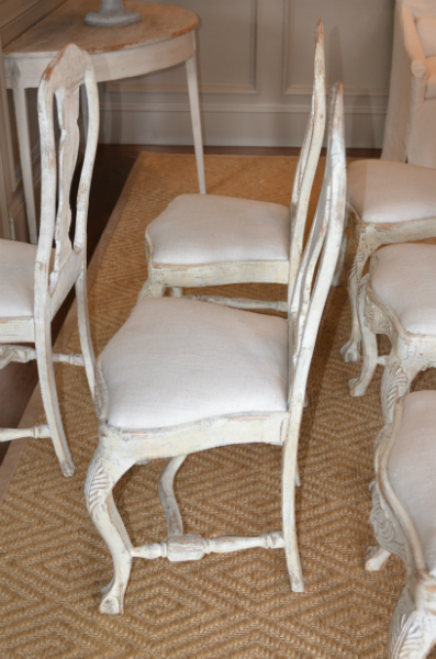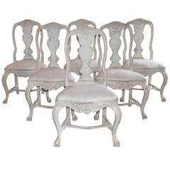 Wonderful set of six Swedish Rococo style dining chairs. Carved apron and back with turned stretcher cabriole legs and ball and claw feet. Cream light ochre color. Upholstered in antique Swedish Hemp. circa 1870