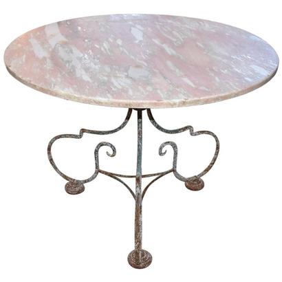 VIntage French iron garden table. Lovely iron scrolled base with pale pink and green old paint patina. Original pink marble top. 29" H x 36" D