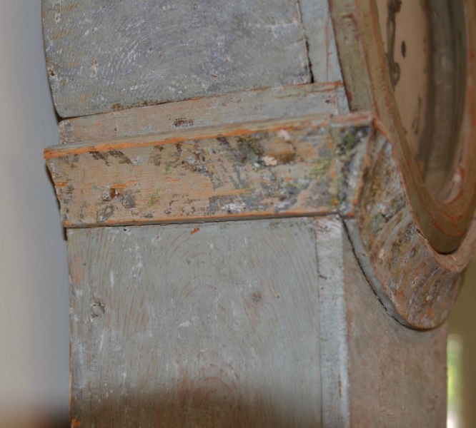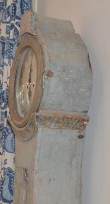 Very nice 18th century Swedish mora clock hand scrapped down to the original lovely blue/green color. Parts have been serviced and are in working order. 85.5" H x 25" W x 10" D $5400