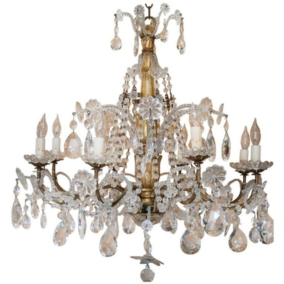 19th Century Italian gilded wood and crystal ten light chandelier. Lovely beaded and crystal drop leaf ornamentation over broze arms. Newly wired and restored. 30" H x 29" W x 29" D. $4400