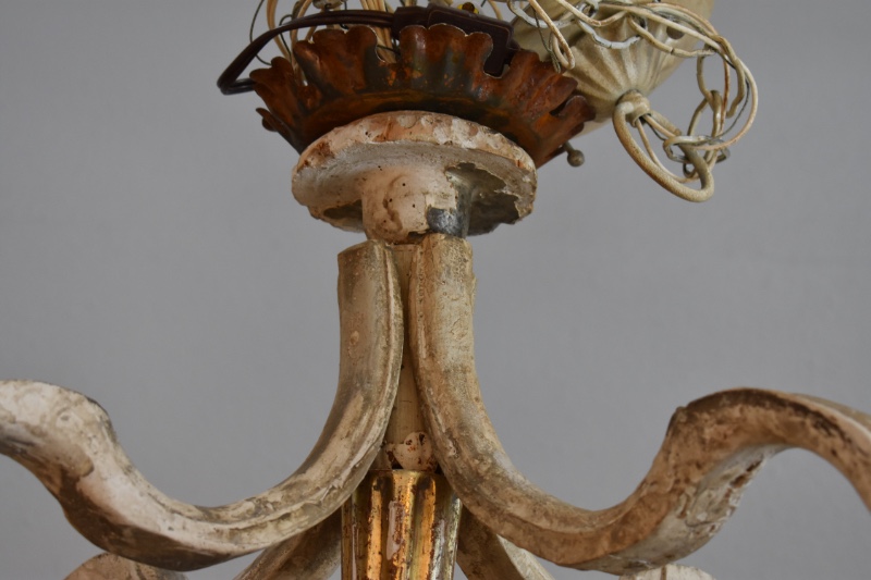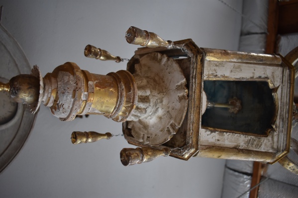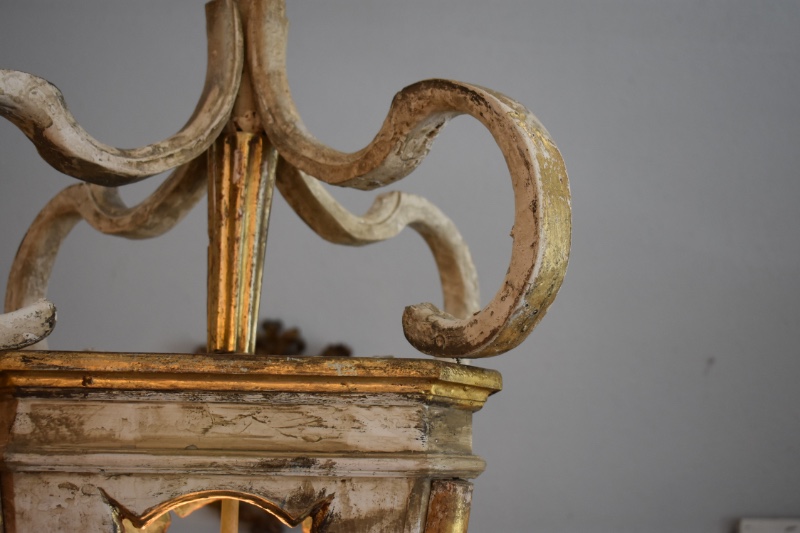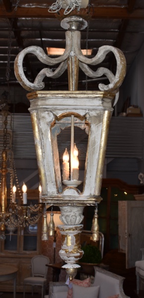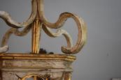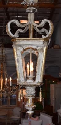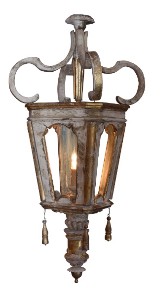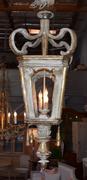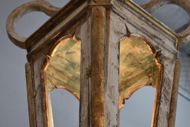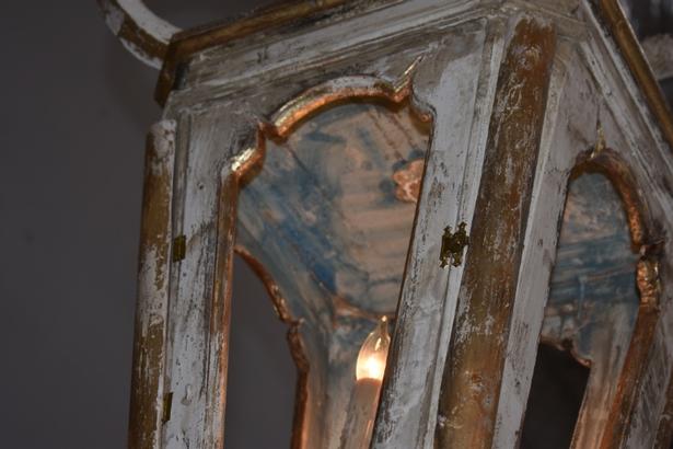 Antique wooden Italian lantern newly wired. Great aged gilded wood with hints of soft blue, cream, white and gold. A matching pair is available 45" H X 17" W