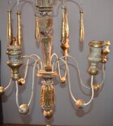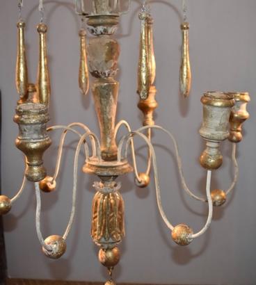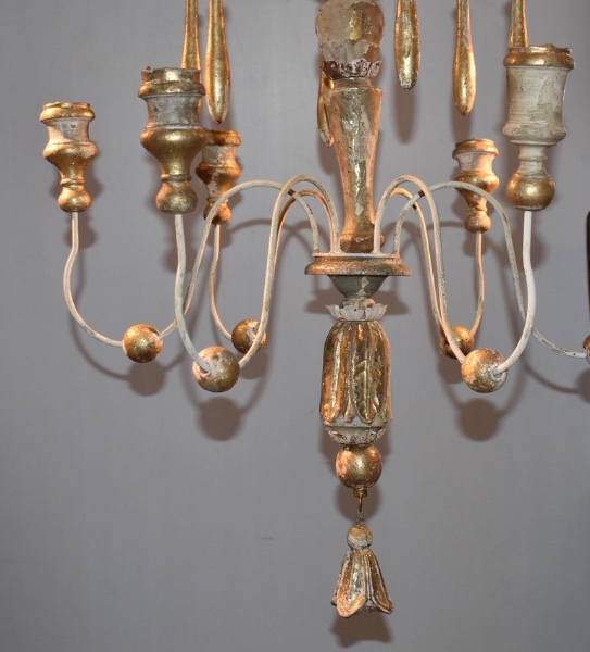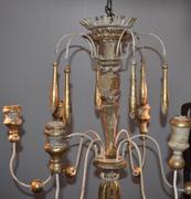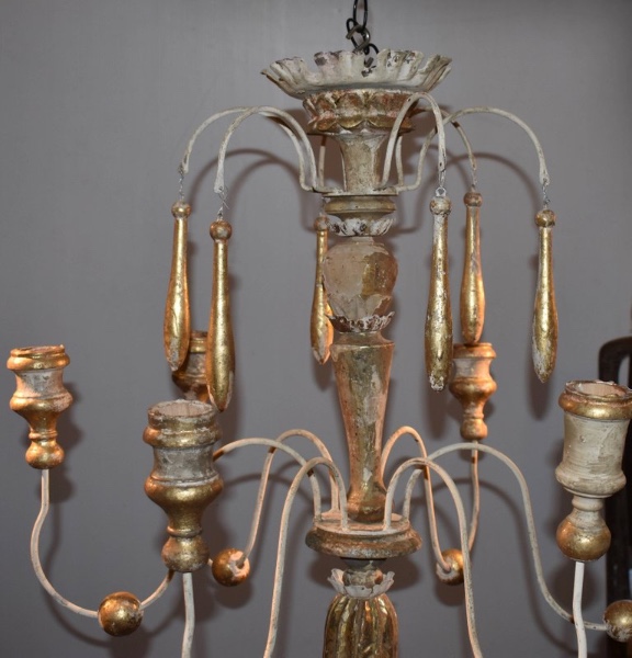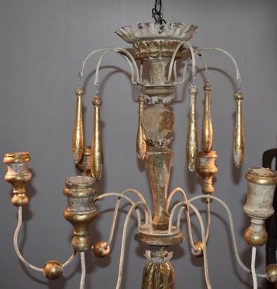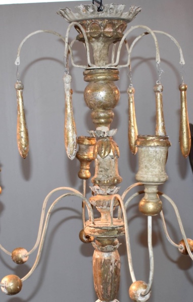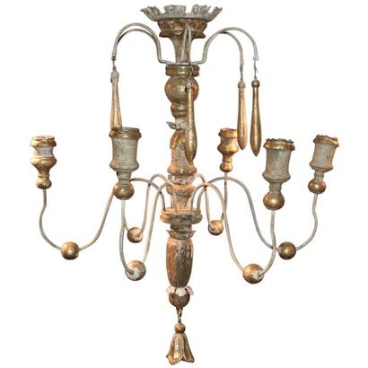 Italian wood chandelier made from 18th century church candlesticks. Great aged patina. Lovely cream/white color with hints of gilded gold. Not yet wired. Others of similiar style available.