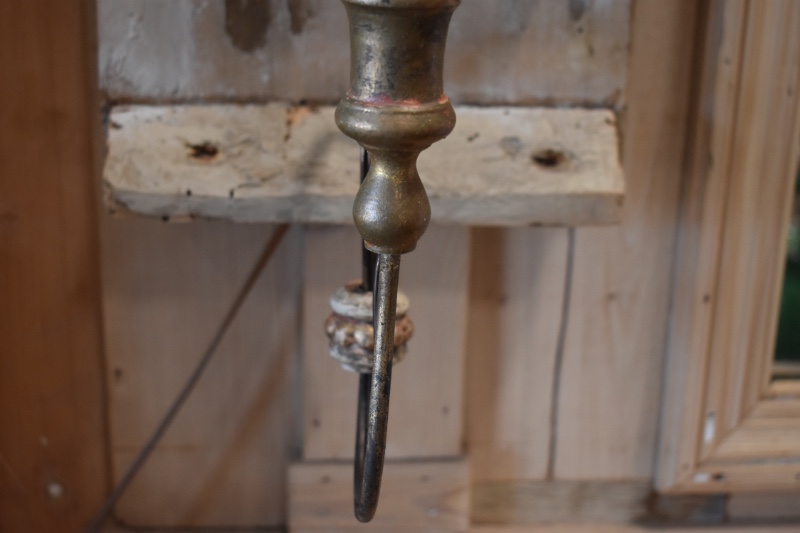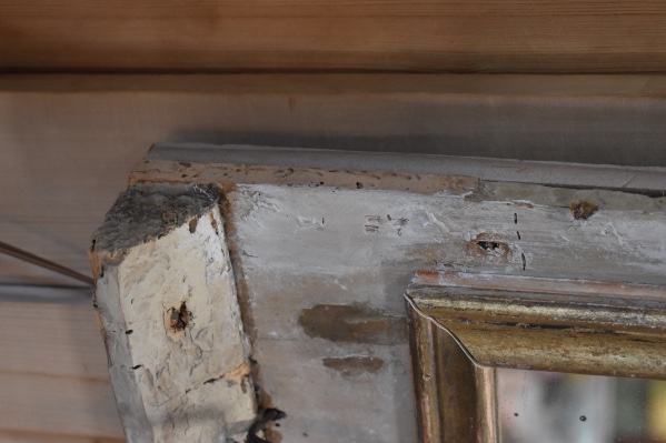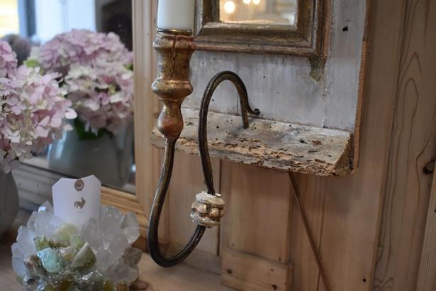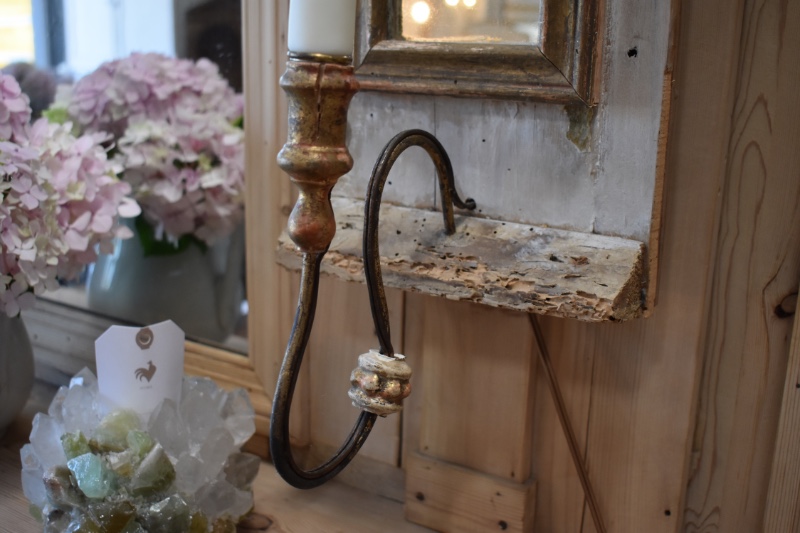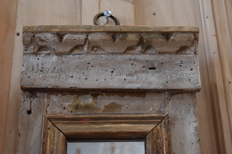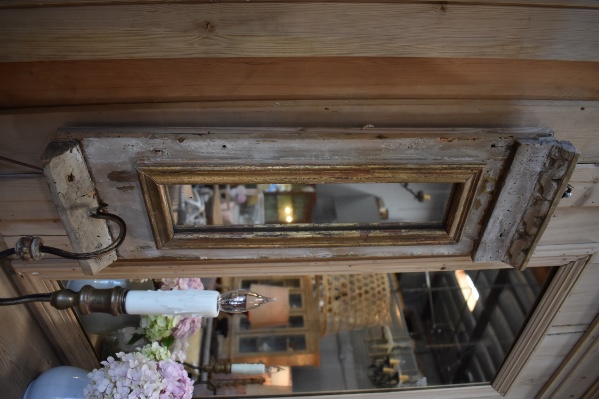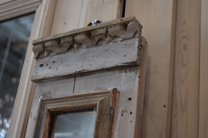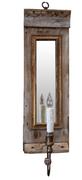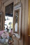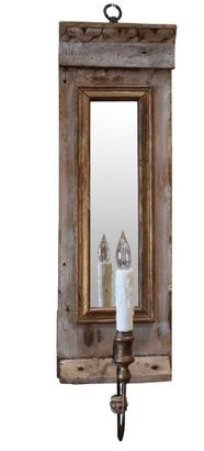 Pair of French antique wood fragments converted into handsome mirrored sconces. Great aged patina with bits of gilding over cream/ white color. Newly wired